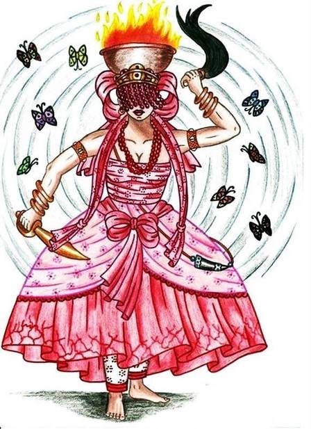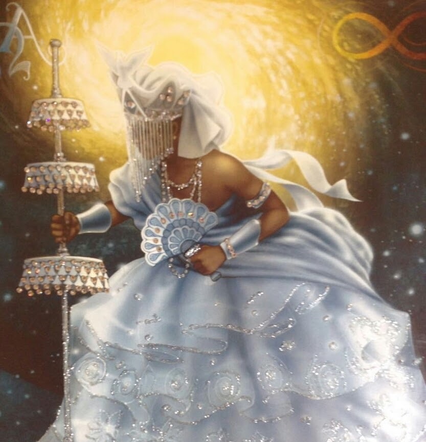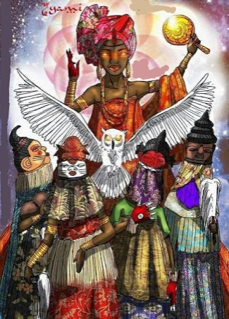 Iyami Oxorongá bruxa mulher pássaro africano, Oxorongá emite um som onomatopaico de onde provém seu nome. É o símbolo do Orixá Iyami, ai o vemos em suas mãos. Aos seus pés, a coruja dos augúrios e presságios. Iyami Oxorongá é a dona da barriga e não há quem resista aos seus ebós fatais, sobretudo quando ela executa o Ojiji, o feitiço mais terrível. Com Iyami todo cuidado é pouco, ela exige o máximo respeito.