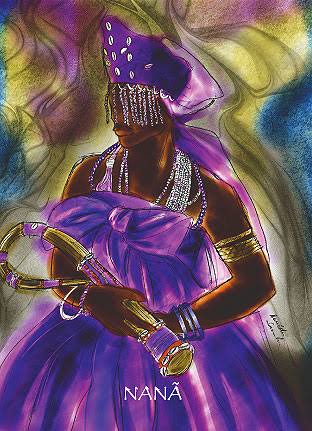 Dizem que quando Olorum encarregou Oxalá de fazer o mundo e modelar o ser humano, o Orixá tentou vários caminhos. Tentou fazer o homem de ar, como ele. Não deu certo, pois o homem logo se desvaneceu. Tentou fazer de pau, mas a criatura ficou dura. De pedra, mas ainda a tentativa foi pior. Fez de fogo e o homem se consumiu. Tentou azeite, água e até vinho de palma, e nada. Foi então que Nanã veio em seu socorro e deu a Oxalá a lama, o barro do fundo da lagoa e pântanos onde morava ela, a lama sob as águas, que é Nanã. Oxalá criou o homem, o modelou no barro. Com o sopro de Olorum ele caminhou. Com a ajuda dos orixá povoou a Terra. Mas tem um dia que o homem tem que morrer. O seu corpo tem que voltar à terra, voltar à natureza de Nanã. Nanã deu a matéria no começo mas quer de volta no final ao qual a terra voltará.